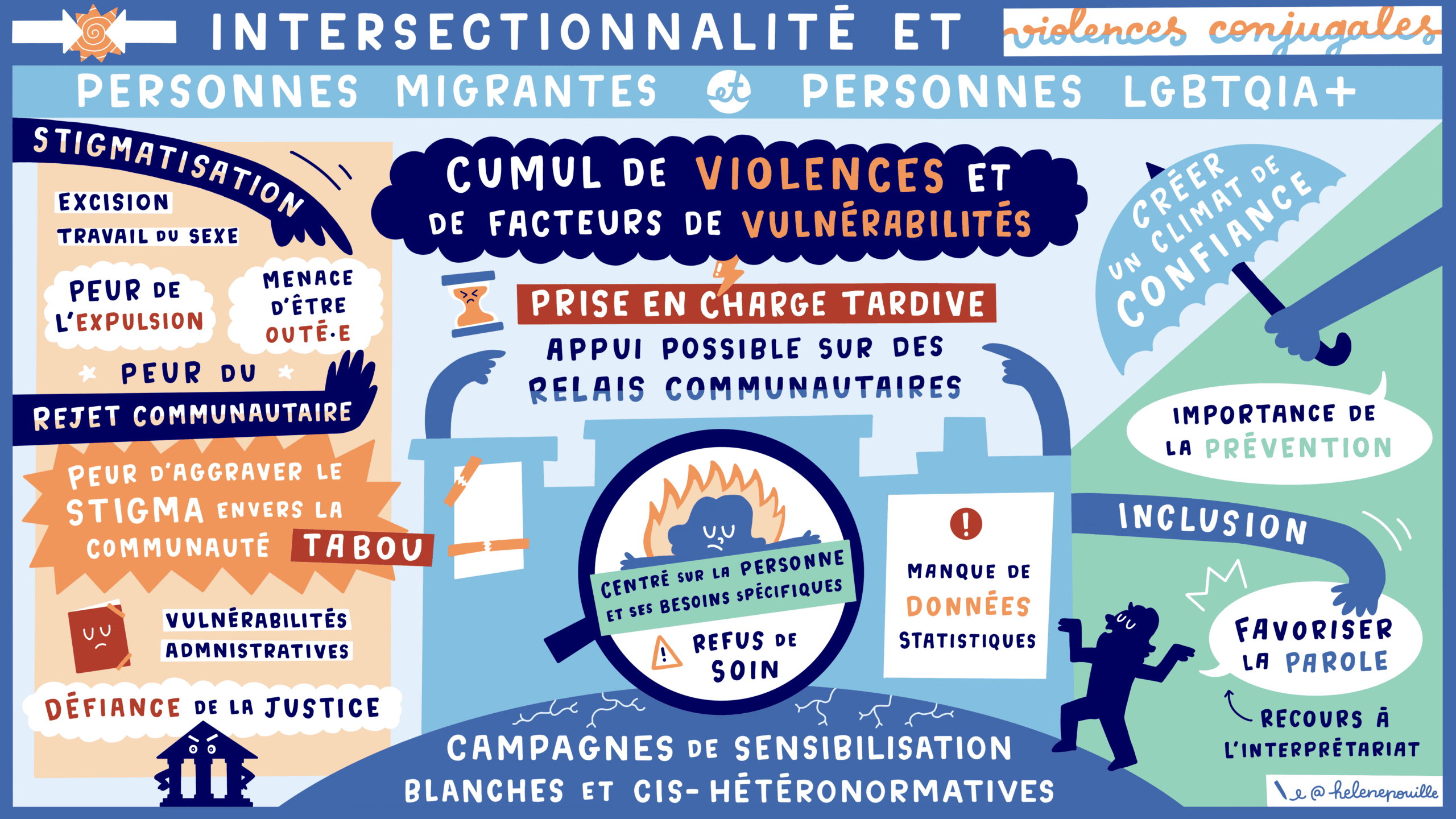 Six intervenant-es aux expertises complémentaires étaient présent-es pour partager leurs expériences et éclairer les enjeux actuels : Reju Rob, géographe de la santé, Raphaël Walczak, sage-femme de la Maison des femmes de Saint-Denis, Laëtitia Lasne, cheffe de service de l’UMJ de l’hôpital Jean Verdier, Soraya Haffad, directrice de l’association Nénuphar Médiation, Caroline Daniel, intervenante sociale du commissariat, Ingrid Poczobut, responsable du pôle Prévention, Médiation Urbaine et Accompagnement des Victimes de la ville de Pantin et Laure Dominjon, médecin généraliste exerçant au CheckPoint Paris, centre de santé sexuelle à approche communautaire dédié aux communautés LGBTI+ et travailleur-ses du sexe. Leurs contributions ont permis de mettre en lumière les difficultés rencontrées pour orienter les victimes, pour valoriser les bonnes pratiques et permettre d’identifier clairement les ressources du territoire.